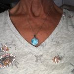 This is a beautiful necklace at a great length. It’s not too heavy, either. I love the blue sky color with the little ‘clouds’ inside. It makes me happy when I wear it. Definitely a unique item.