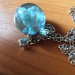 I wasnt sure what to expect, however, this Blue Sky Cloud Resin Necklace is a pretty piece of casual costume jewelry. It might not go with a cocktail dress but it looks cute with jeans. The resin globe is about 3/4 of an inch round. Reminds me of a gum ball. You can see the cloud formations are different through out the pendant and I am sure each one is unique and no two are the same.