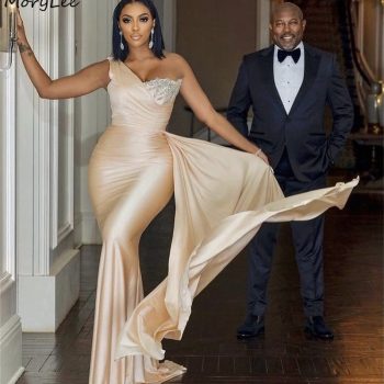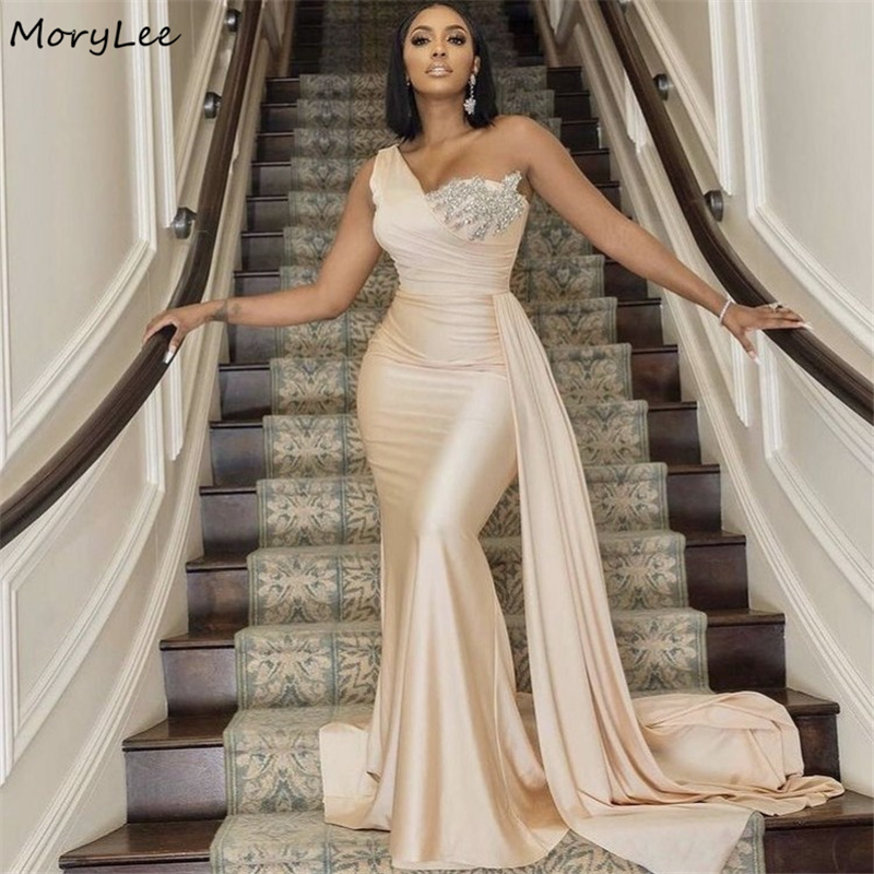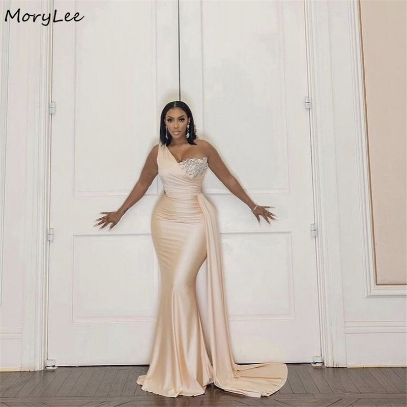 Crystal Bridesmaid Dresses Champagne One Shoulder Sleeveless Mermaid Silk Satin Wedding Bridesmaid Gowns With Lace Up Back
